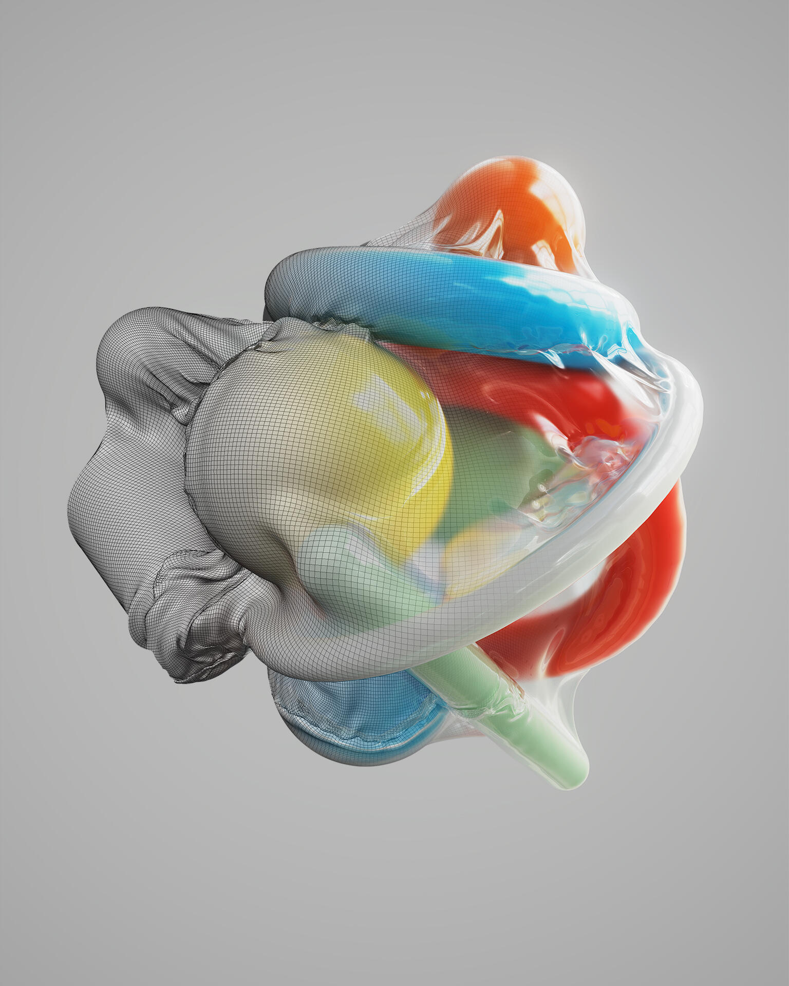 I started with the assembly of simple geometric shapes. Afer that with these elementary forms and sculpted a fragile spherical surface to emulate the classic texture of plastic packaging.What sets this piece apart is the intricate physical simulation that I used to replicate the industrial process of extracting air from the packaging and sealing it hermetically. Through a meticulous and advanced simulation, I reenacted the industrial procedure of evacuating the air from the package, mimicking the real-world process.
