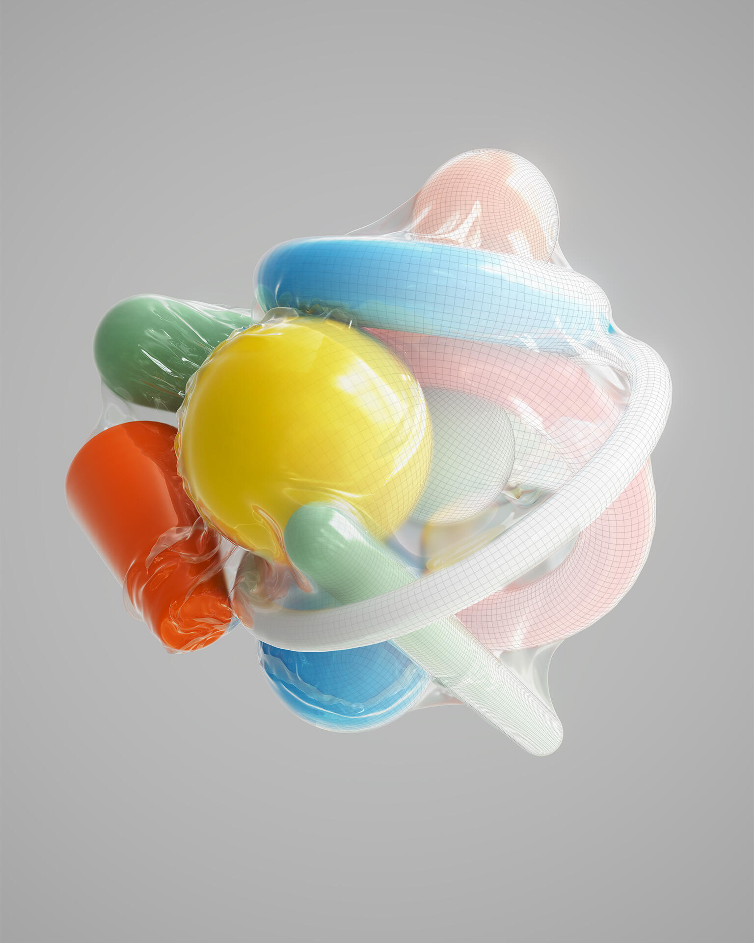 I started with the assembly of simple geometric shapes. Afer that with these elementary forms and sculpted a fragile spherical surface to emulate the classic texture of plastic packaging.What sets this piece apart is the intricate physical simulation that I used to replicate the industrial process of extracting air from the packaging and sealing it hermetically. Through a meticulous and advanced simulation, I reenacted the industrial procedure of evacuating the air from the package, mimicking the real-world process.