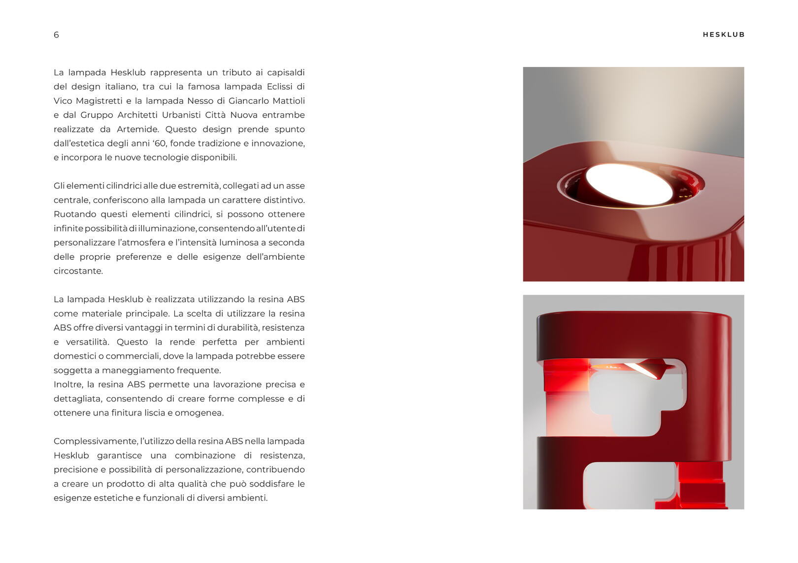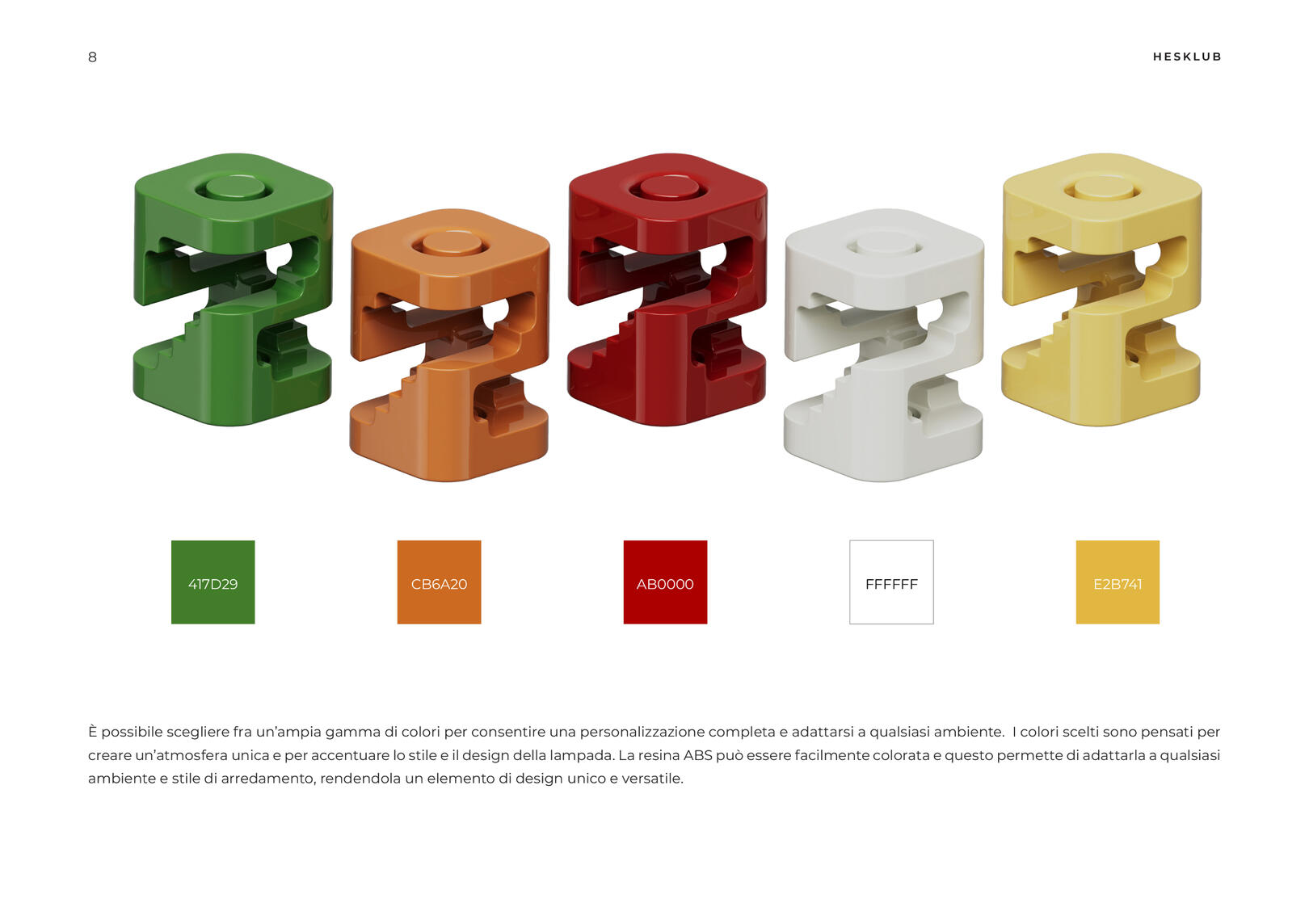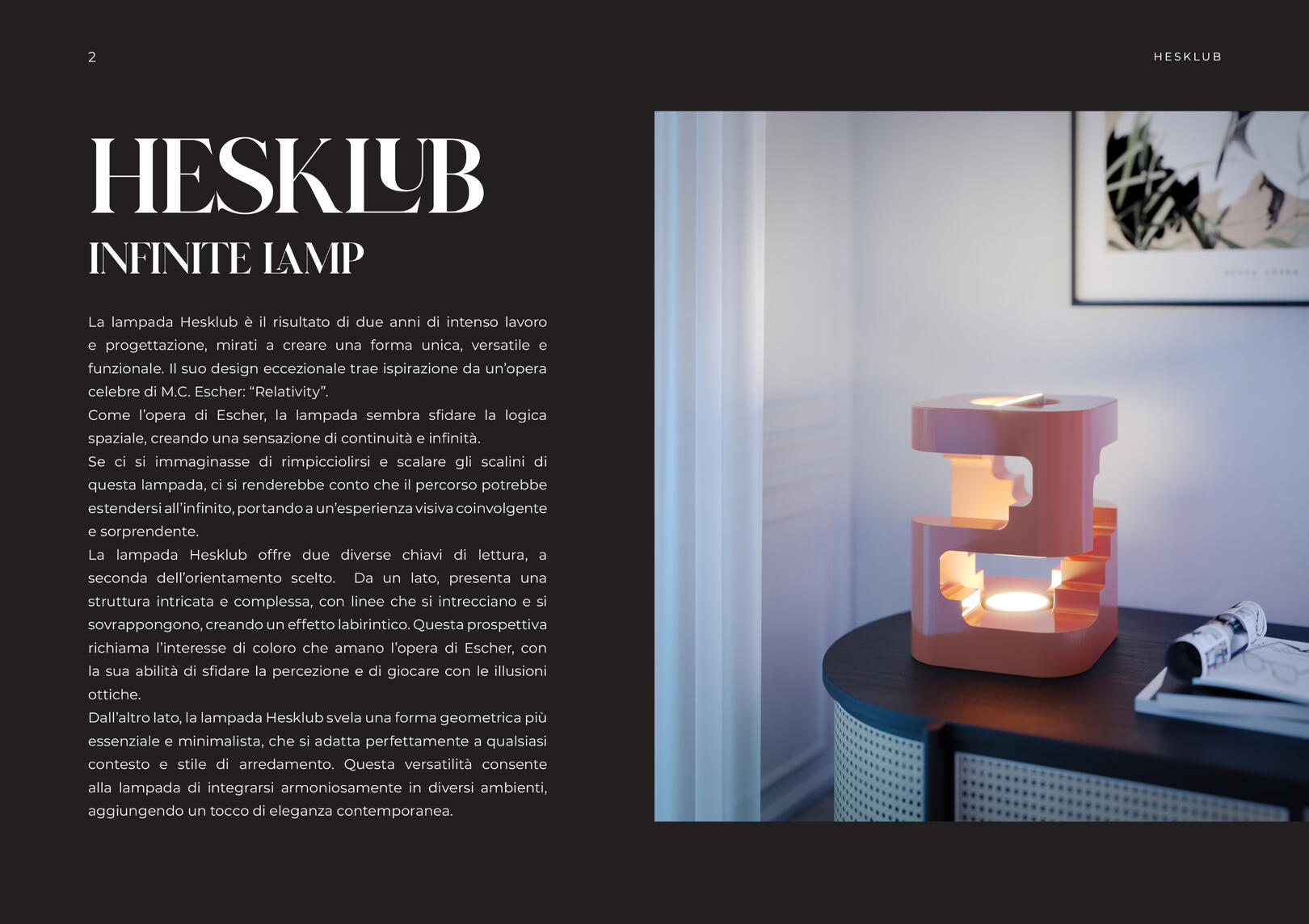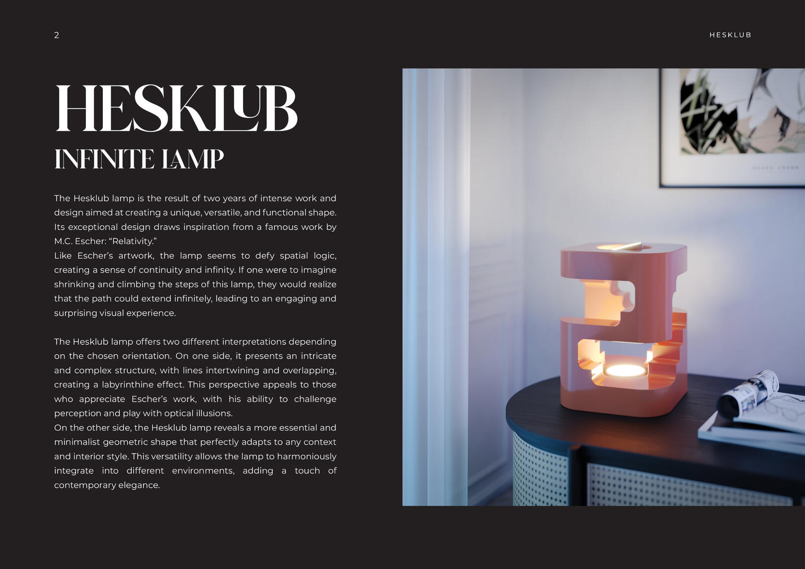 The Hesklub lamp offers two different interpretations depending on the chosen orientation. On one side, it presents an intricate and complex structure, with lines intertwining and overlapping, creating a labyrinthine effect. This perspective appeals to those who appreciate Escher’s work, with his ability to challenge perception and play with optical illusions. On the other side, the Hesklub lamp reveals a more essential and minimalist geometric shape that perfectly adapts to any context and interior style. This versatility allows the lamp to harmoniously integrate into different environments, adding a touch of contemporary elegance.